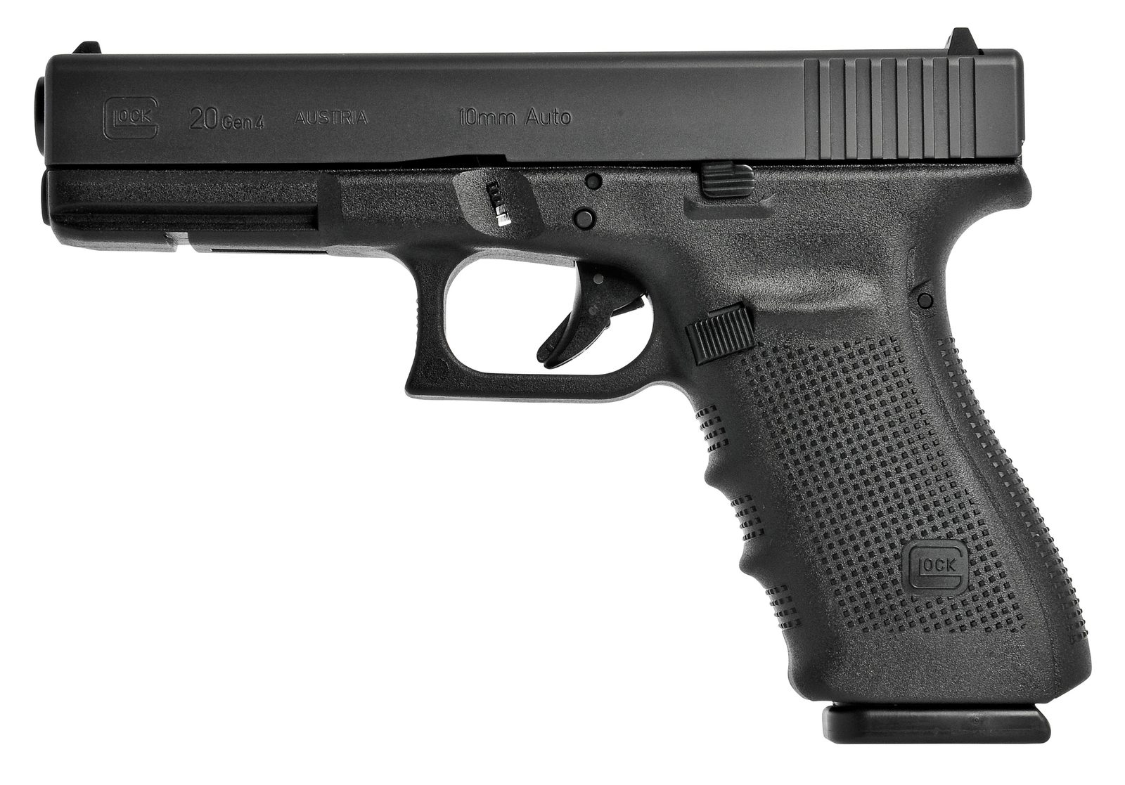 Pistole GLOCK 20 Gen. 4 s dvouřadým zásobníkem je v ráži 10 mm Auto. Pistole je vhodná pro denní nošení a terčovou střelbu. Standardně jsou pistole Glock dodávány v sadě s 3 ks zásobníky na 15 nábojů. Dále je dodáván s kufříkem na zbraň, základním čištěním a výměnnými hřbety s bobřím ocasem o dvou rozdílných šířkách aby sedly každé ruce (výměnný dlouhý pin a nástroj pro výměnu hřbetů). Model 20 je častou volbou střelců, kteří chtějí spolehlivou a pohodlnou zbraň pro sebeobranu i proti medvědům (nejprodávanější zbraň na Aljašce na obranu proti losům a medvědům grizzly) a zájmovou střelbu na střelnici. Zbraň má služební rozměry (vojenská velikost pistole - Full Size) a nízkou hmotnost.