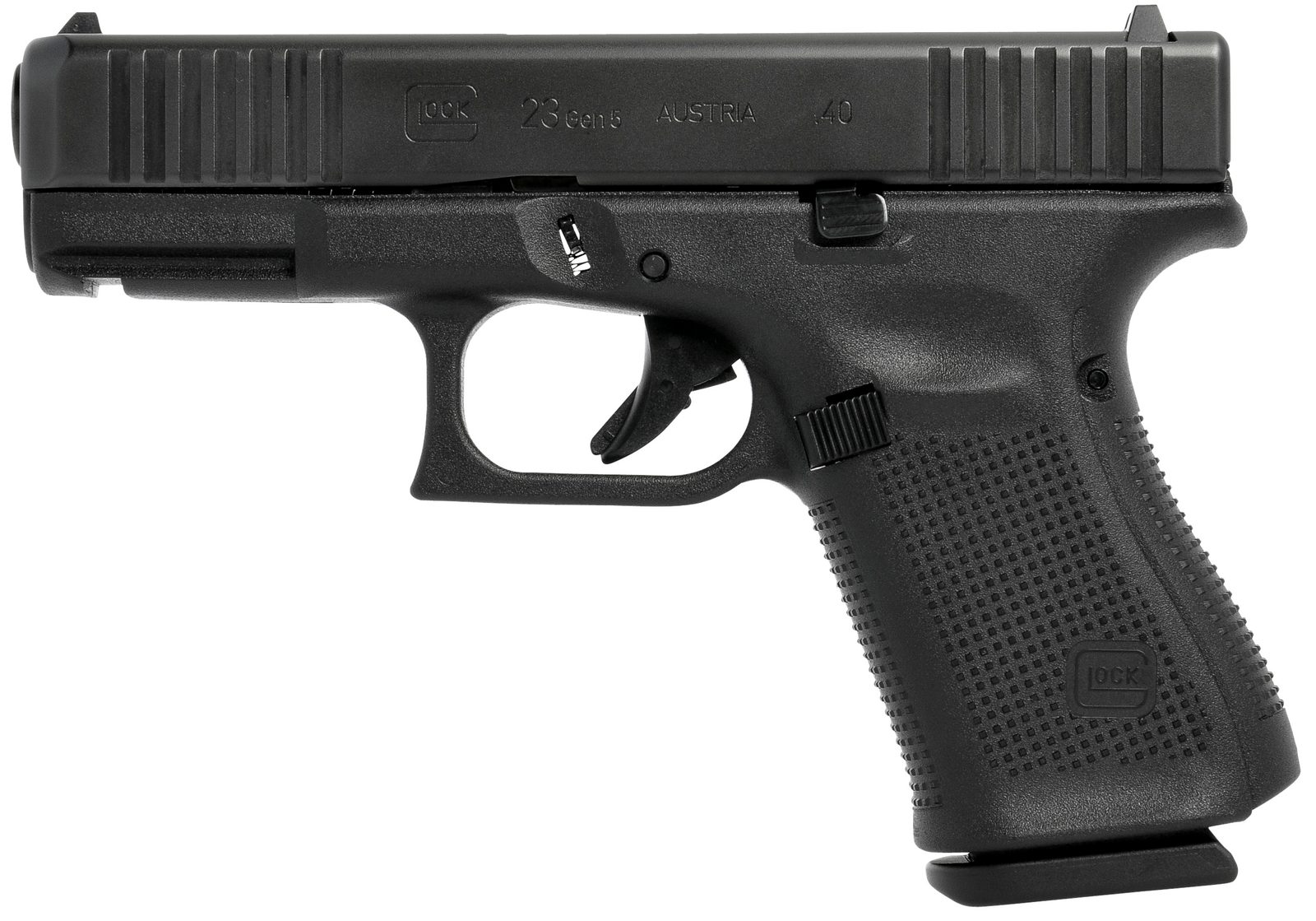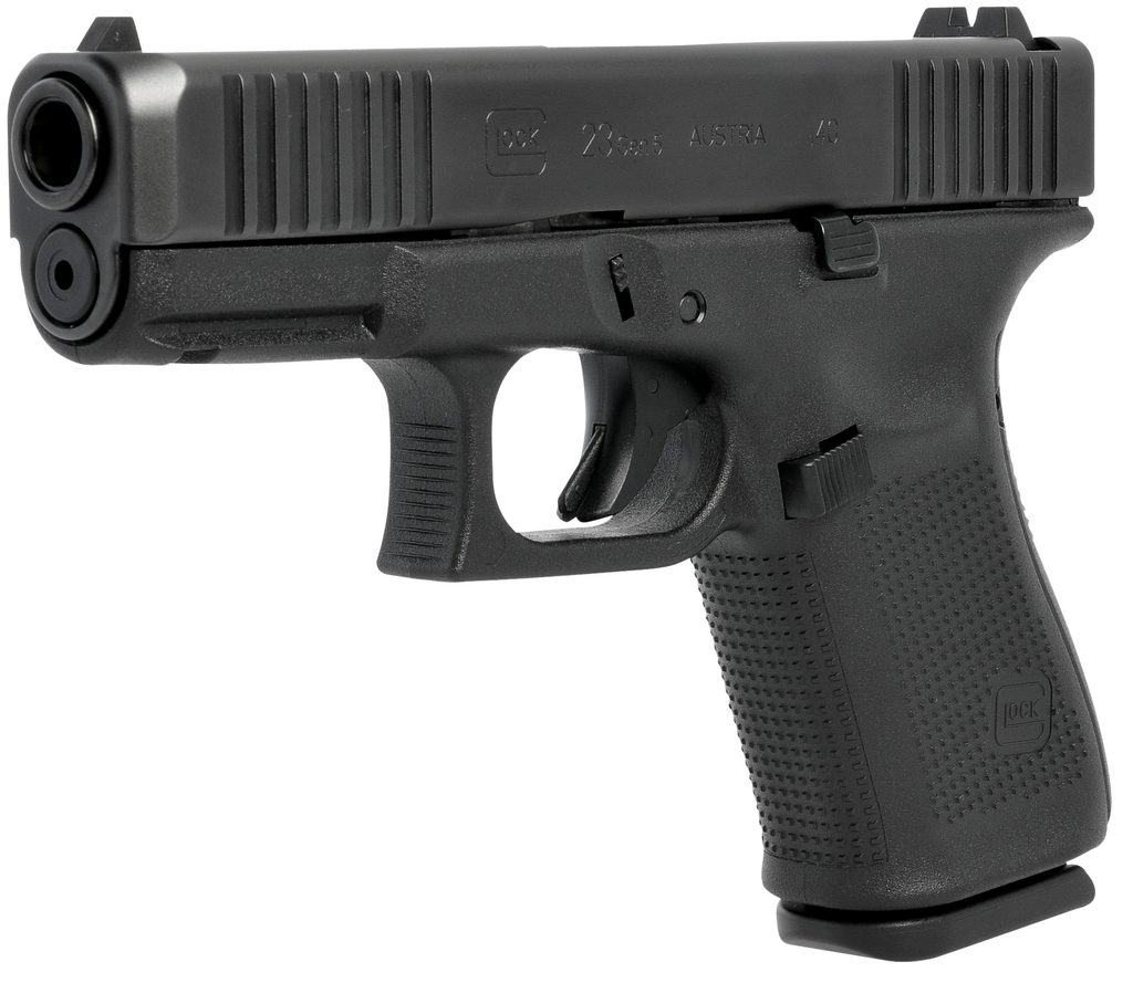 Pistole GLOCK 23 Gen. 5 s dvouřadým zásobníkem je v ráži .40 SW. Pistole je snad nejčastější volbou střelců pro denní nošení a sebeobranu. Standardně jsou pistole Glock dodávány v sadě s 2 ks zásobníků na 13 nábojů. Dále je dodáván s kufříkem na zbraň, základním čištěním a výměnnými hřbety s bobřím ocasem o dvou rozdílných šířkách aby sedly každé ruce (výměnný dlouhý pin a nástroj pro výměnu hřbetů). Model 23 je častou volbou střelců, kteří chtějí spolehlivou a pohodlnou zbraň pro sebeobranu a zájmovou střelbu na střelnici. Zbraň má služební rozměry (policejnívelikost pistole - Compact) a nízkou hmotnost.