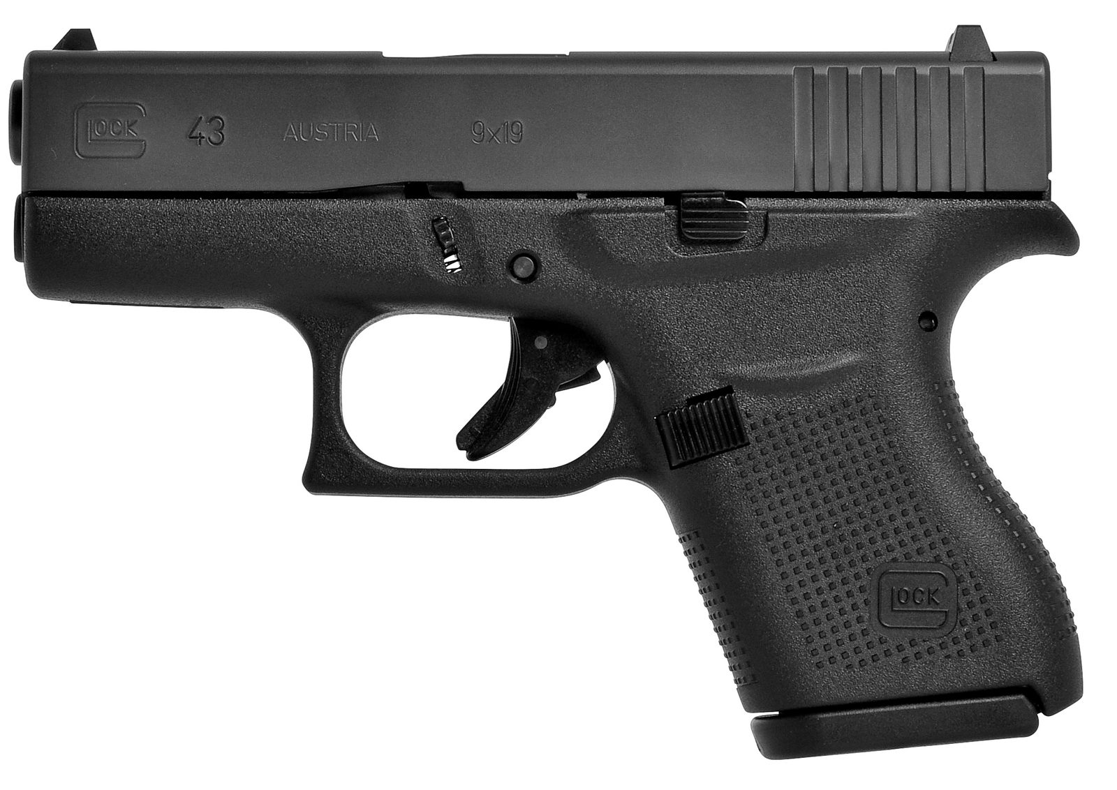 Pistole GLOCK 43 s jednořadým zásobníkem je v ráži 9x19. Pistole je vhodná pro skryté nošení. Standardně jsou pistole Glock 43 dodávány v sadě s 2 ks zásobníků s prodlouženou botkou na 6 nábojů. Dále je dodáván kufřík na zbraň a základní čištění. Model 43 je častou volbou střelců, kteří chtějí kompaktní zbraň pro skryté a denní nošení. Zbraň má kompaktní rozměry a nízkou hmotnost. Tyto vlastnosti zajišťují snadné skrytí zbraně pod oblečením.