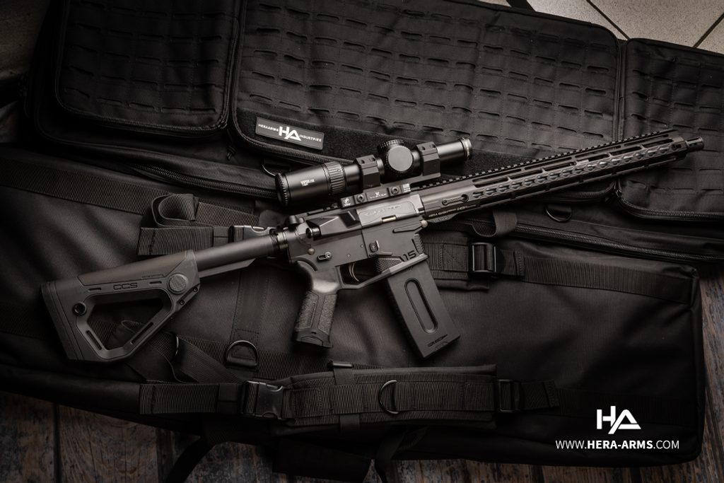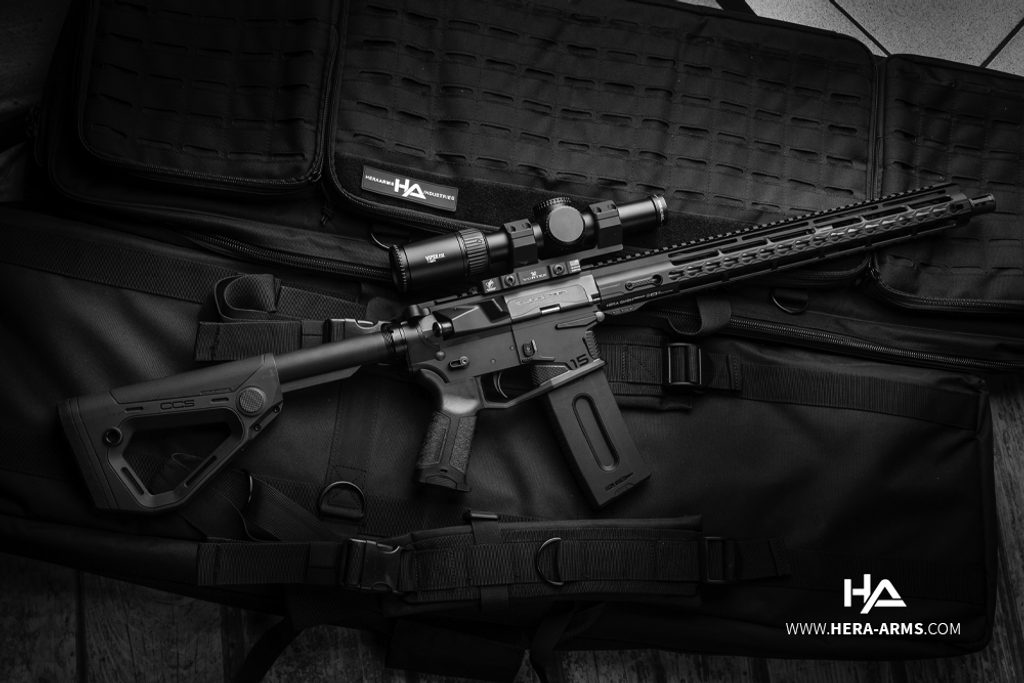 Kvalitní poloautomatická puška typu AR-15 německé firmy Hera Arms 15th - s délkou hlavně 16,75". Ráže .223 Remington. Stoupání hlavně je 1/9. Zbraň je osazena montážní lištou weaver 22 mm pro umístění optického zařízení a jiného příslušenství nad hlaveň. Předpažbí je vybaveno montážním systémem typu key-mode. Hlaveň je osazena tlumičem záblesku A2. Pistolová rukojeť má krytý prostor v rukojeti pro příslušenství (baterie,...). Nastavitelná pažba. Barva černá.