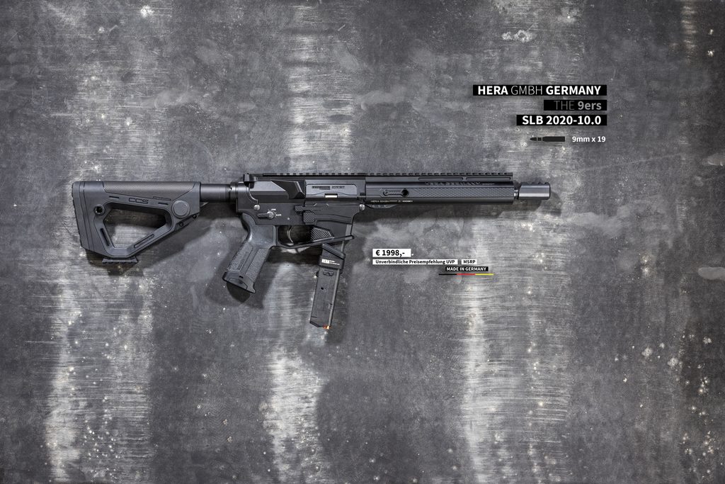 Kvalitní poloautomatická pistolová karabina německé firmy Hera Arms 9ers - s délkou hlavně 10". Ráže 9 mm Luger. Stoupání hlavně je 1/10. Zbraň je osazena montážní lištou weaver 22 mm pro umístění optického zařízení a jiného příslušenství nad hlaveň. Předpažbí je vybaveno montážním systémem typu key-mode. Hlaveň je osazena úsťovou brzdou PCC (sport) z produkce firmy Hera Arms. Pistolová rukojeť má krytý prostor v rukojeti pro příslušenství (baterie,...). Nastavitelná pažba. Zásobníky Glock 9 mm Luger (zbraň je také možné objednat s konverzí pro zásobníky Colt).