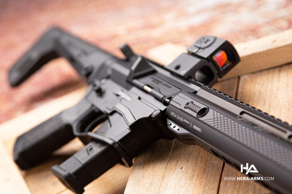 Kvalitní poloautomatická pistolová karabina německé firmy Hera Arms 9ers - s délkou hlavně 13,5". Ráže 9 mm Luger. Stoupání hlavně je 1/10. Zbraň je osazena montážní lištou weaver 22 mm pro umístění optického zařízení a jiného příslušenství nad hlaveň. Předpažbí je vybaveno montážním systémem typu key-mode. Hlaveň je osazena úsťovou brzdou PCC (sport) z produkce firmy Hera Arms. Pistolová rukojeť má krytý prostor v rukojeti pro příslušenství (baterie,...). Nastavitelná pažba. Zásobníky Glock 9 mm Luger (zbraň je také možné objednat s konverzí pro zásobníky Colt).