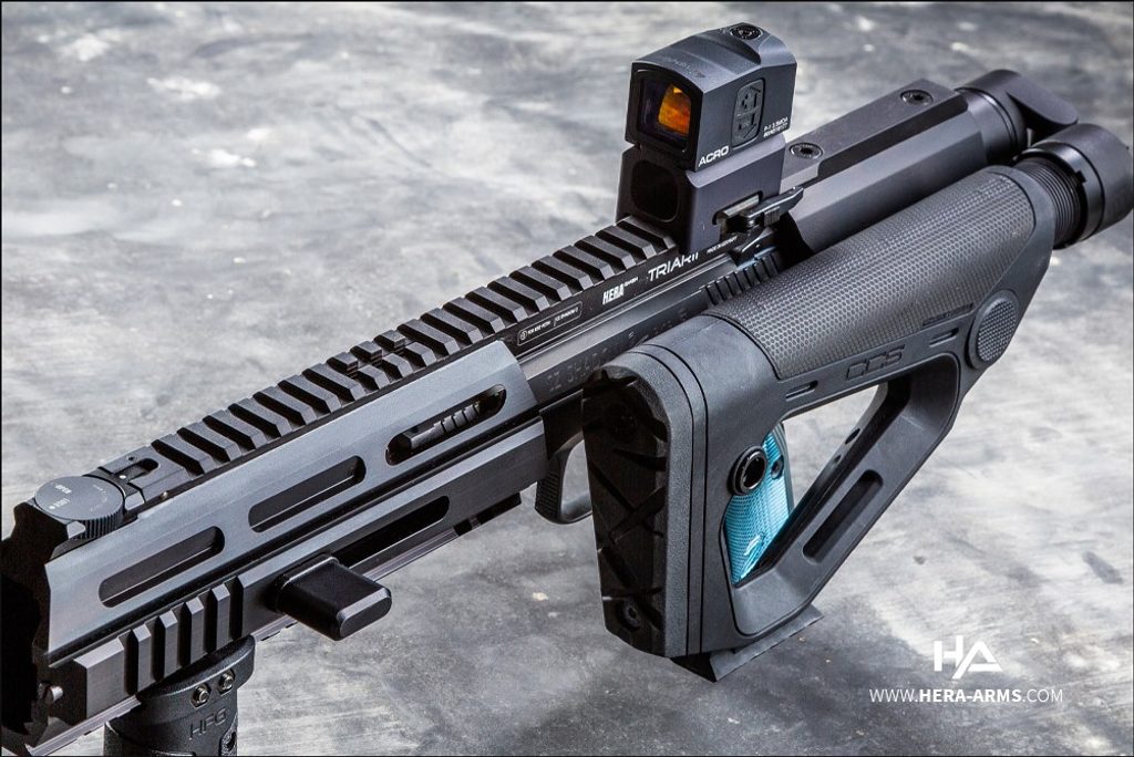 Hera Arms TRIARII musí mít každý, kdo chce ze své pistolí vytěžit maximum. Pistole lze během pár sekund přestavět na sportovní pistolovou karabinu bez nutnosti jakýchkoli úprav původní zbraně. Pistole se uchycuje zasunutím zbraně do předpažbí a zajišťuje se aretací otočného mechanismu. S možností nastavení úhlu na pažbě Vám konverzní kit poskytne pevný a pohodlný úchop při střelbě. Kit je vybaven lištami picatinny a je u něj možné nainstalovat pažbu pro AR-15 což tomuto kitu nabízí vysoký stupeň modularity.