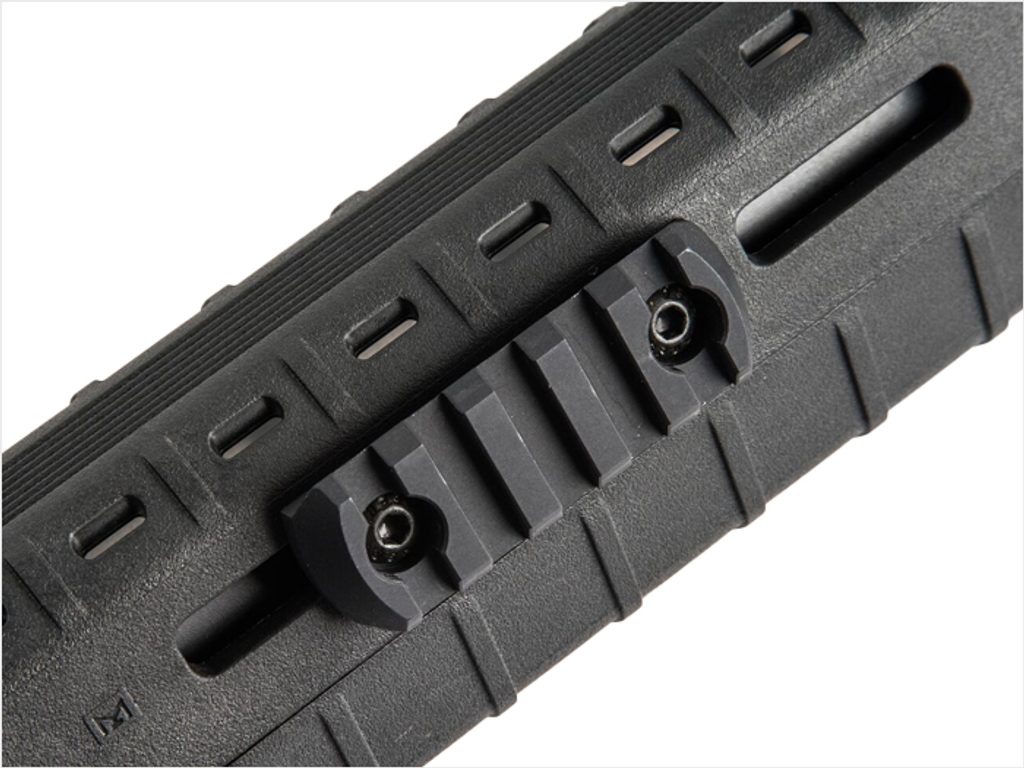 Zesílená, žáruvzdorná polymerová konstrukce poskytuje provozní odolnost bez vysoké hmotnosti. Velké přední prodloužení na spodním okraji chrání uživatele před náhodným dotykem ruky na horkou hlaveň.