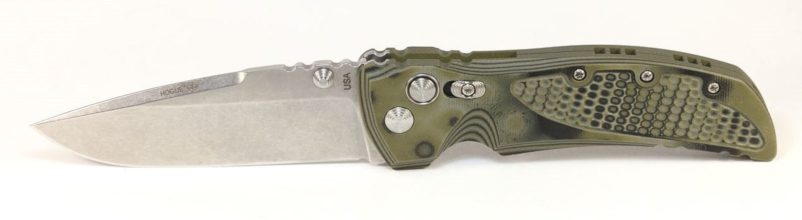 Nůž Hogue EX-01 Drop Point Blade 4" G10 G-Mascus Green, který navrhnul Allen Elishewitz. Čepel Wahrncliffe z kryogenicky ošetřené nerezové oceli 154CM (tvrdost 57-59 HRC) s povrchovou úpravou stainless steel. Zámek PushButton s manuální pojistkou. Rukojeť G-10 G-Mascus s texturou Piranha. Pocket clip je vpravo, střenka obsahuje díru pro lanyard. Celková délka nože 225 mm, délka čepele 102 mm a délka rukojeti 124 mm. Vyrobeno v USA.