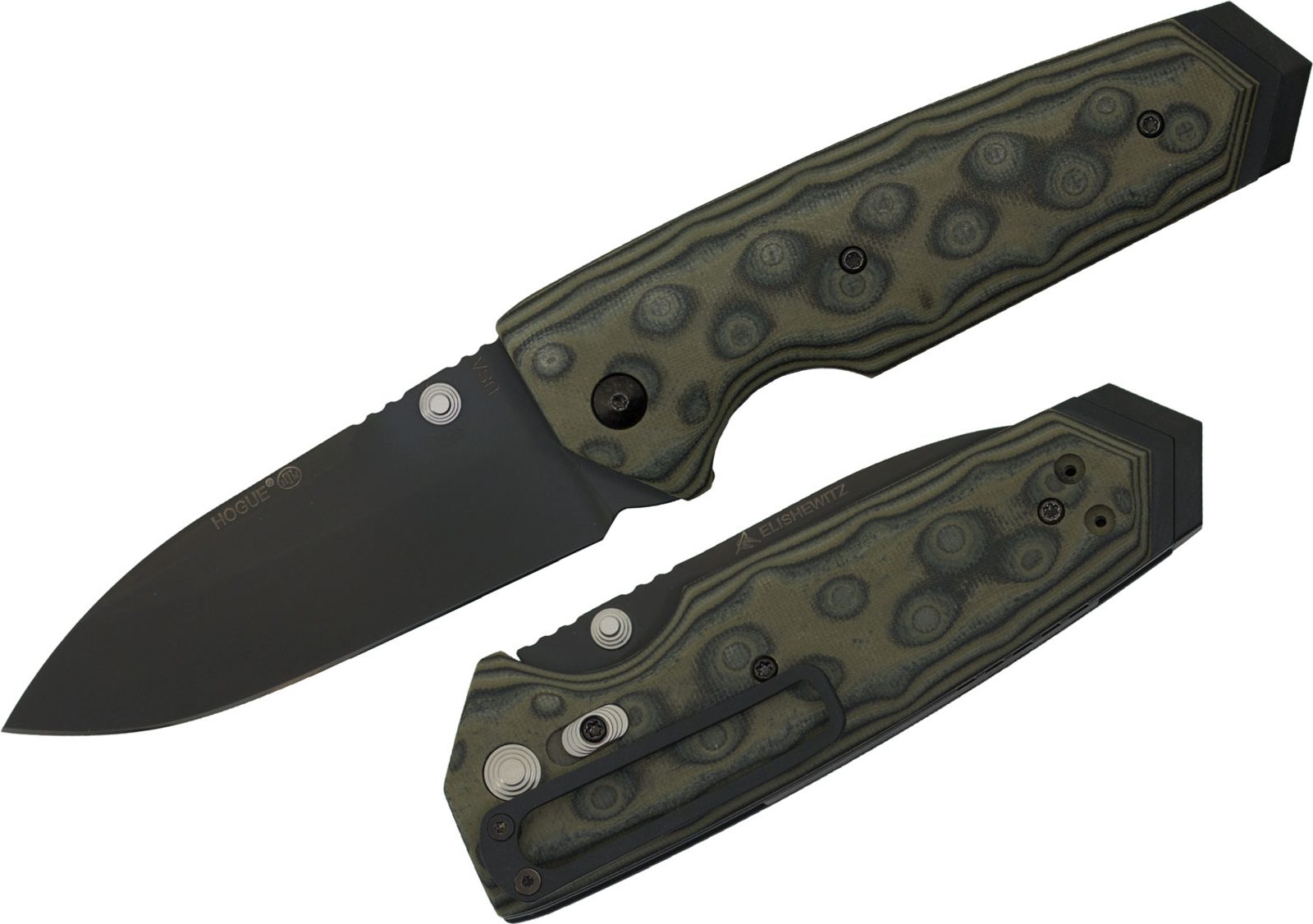 Nůž Hogue EX-02 3,75" Spear Point Thumb G10 G-Mascus Green, který navrhnul Allen Elishewitz. Čepel z kryogenicky ošetřené nerezové oceli 154CM (tvrdost 57-59 HRC) s povrchovou úpravou černý cerakote. Zámek PushButton s manuální pojistkou. Rukojeť G-10 G-Mascus s texturou Mini Piranha. Pocket clip je vpravo, střenka obsahuje díru pro lanyard. Celková délka nože 222 mm, délka čepele 95 mm a délka rukojeti 130 mm. Vyrobeno v USA.