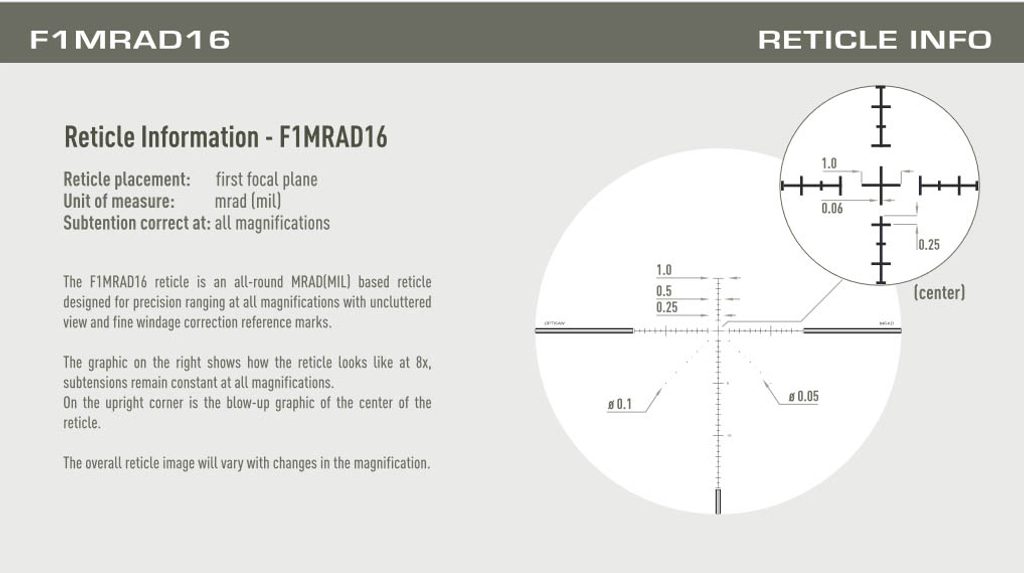 Puškohled Optisan EVX Gen II 4-16X44F1 FFP MRAD F1MRAD16 z nové řady EVX II je nástupcem dosluhující řady EVX. Kříž puškohledu je umístěný v první ohniskové ohniskové rovině (FFP - First Focal Plane, takže velikost kříže se mění spolu se zvětšením). Optický a mechanický systém puškohledů EVX byl kompletně přepracován a tak puškohledy nabídnou o 25% větši zorné pole, lepší rozlišení a věrnější podání barev.