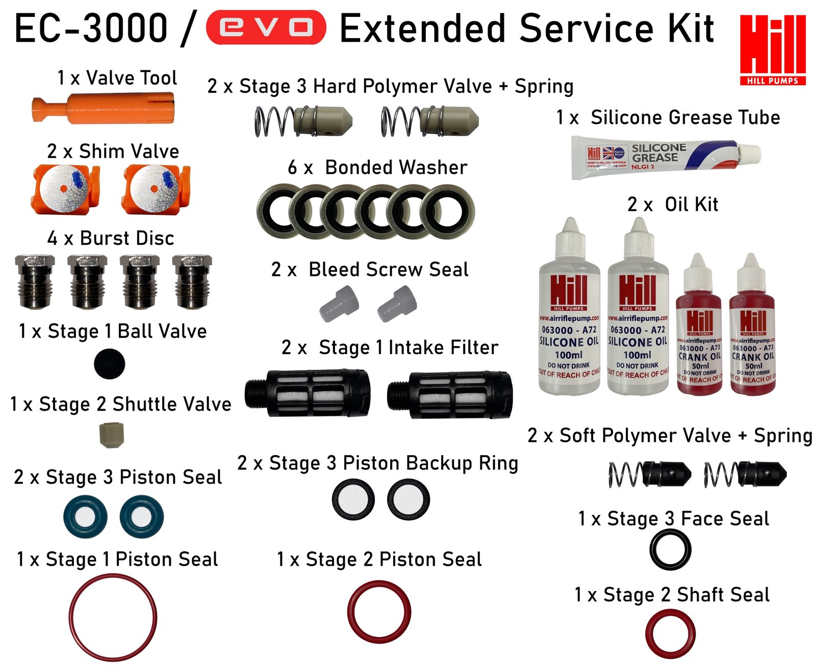 Tato servisní sada je navržena tak, aby pokryla vše, co byste měli potřebovat k provedení prvních 2 servisů na vašem kompresoru EC-3000 / Evo, ty by měly mít provozní dobu 50 a 100 hodin.