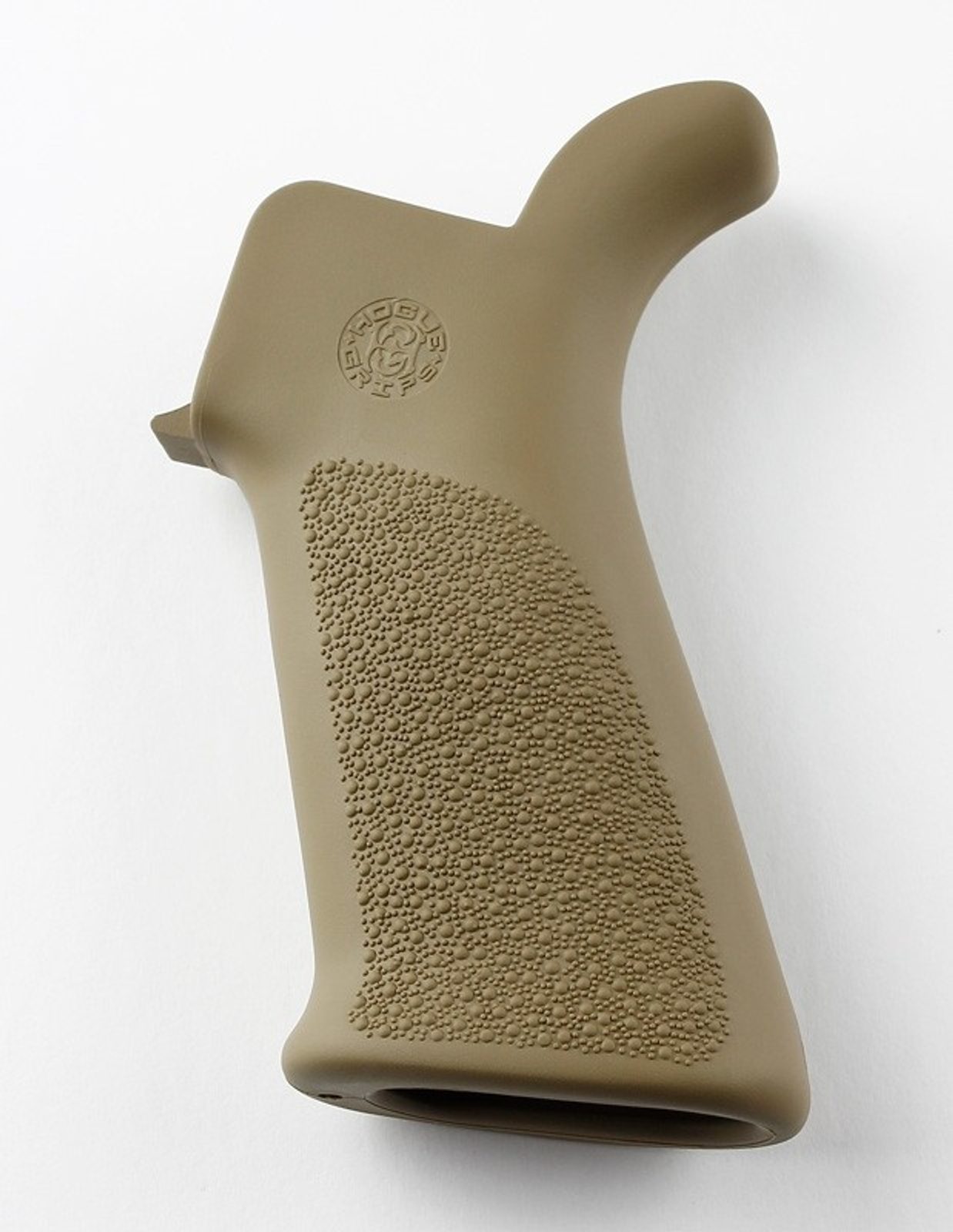 Gumové rukojeti Hogue jsou tvarovány z odolného syntetického kaučuku, který není houbovitý ani lepkavý, ale zároveň poskytuje měkký pocit pohlcující zpětný ráz bez ovlivnění přesnosti. Tento moderní kaučuk vyžaduje zcela odlišný proces lisování než běžný neopren, což má za následek mnohem lepší přilnavost. Flexibilita použitých materiálů a proces tvarování umožňuje vyrábět pryžové rukojeti s vlastnostmi, které fungují pro všechny zbraně.