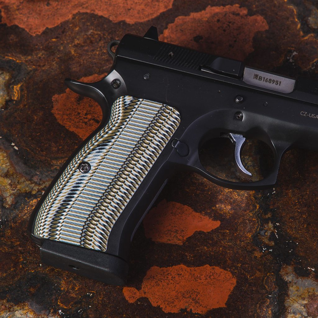 - Pevnost materiálu G10 umožňující nejtenčí možné rukojeti pro pistole s dvojitým zásobníkem.
