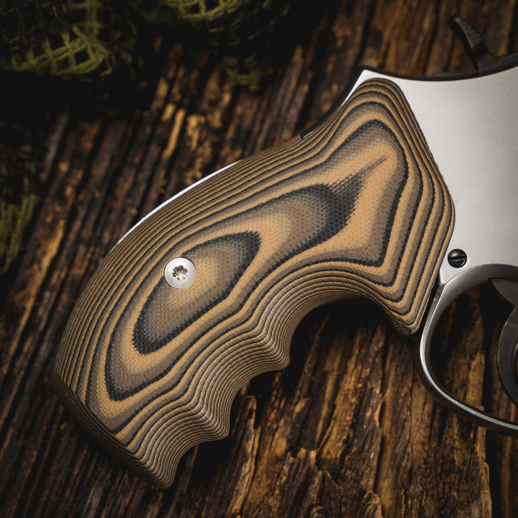 Střenky světoznámé společnosti VZ Grips pro revolvery typu Smith & Wesson K/L rám round butt. Materiál G10, barva Hyena Brown (písková-hnědá). Zdrsnění je jemné (povrch je velmi jemně zdrsněný). Zdrsnění Vás tedy nebude nijak dřít na kůži ale také nebude v ruce klouzat. Tyto střenky jsou vhodné pro denní nošení.