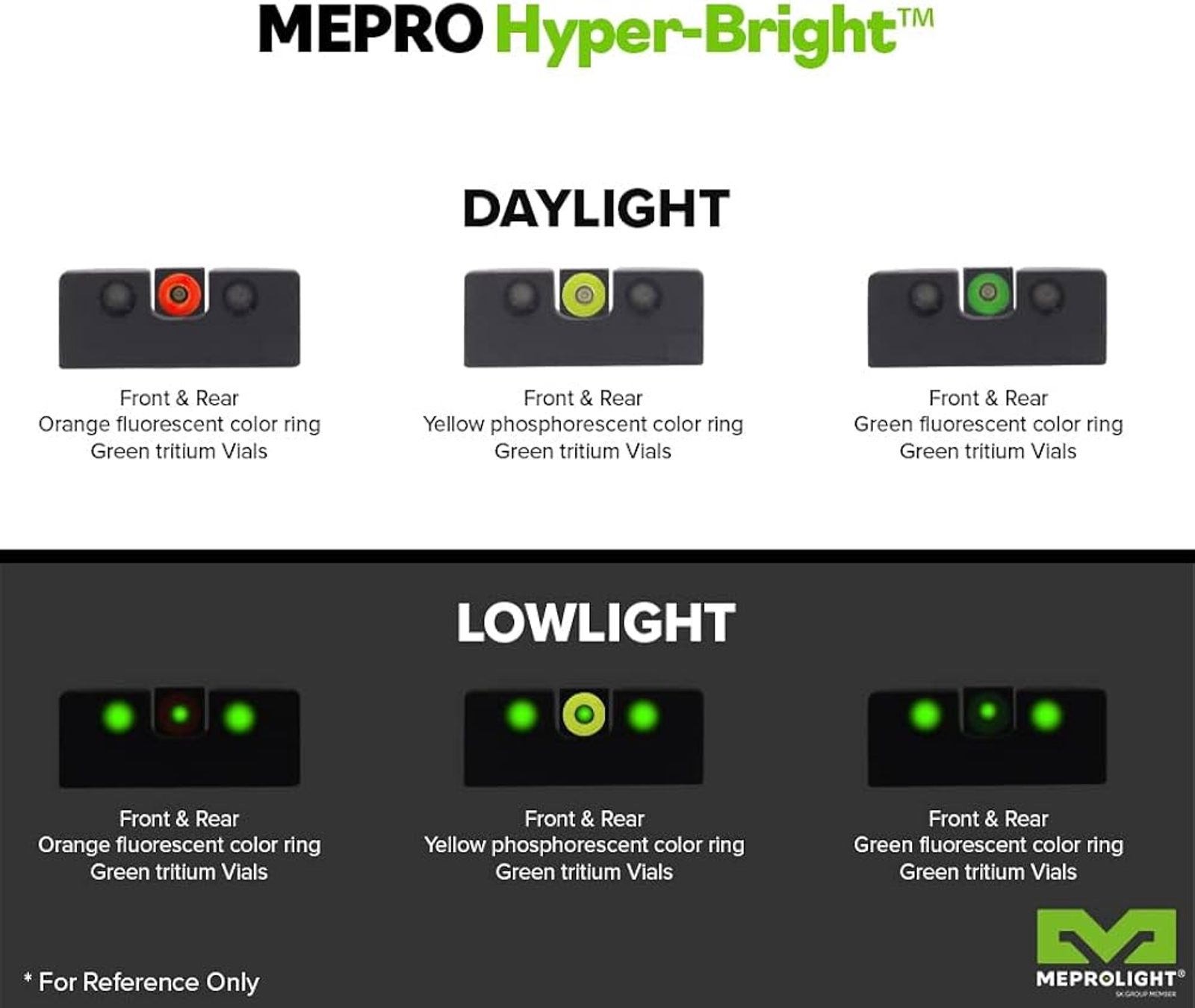 Světově nejjasnější samostatně svítící mířidla standardního tvaru. Mířidla Hyper-Bright vám zajistí jasné míření na cíl ať už střílíte za světla nebo za tmy. Světlá barva trítiových mířidel vám pomůže se ihned zaměřit na mušku, a to za jakýchkoliv podmínek. Často nemůžete predikovat kdy a za jakých podmínek budete střílet.
