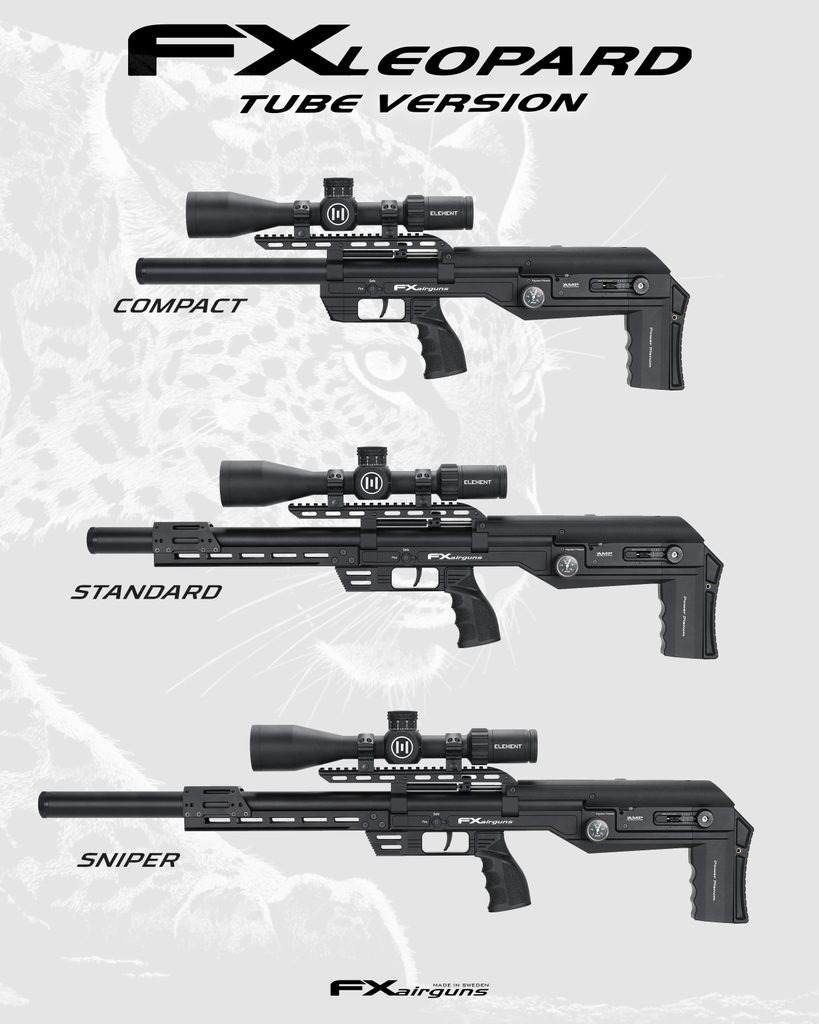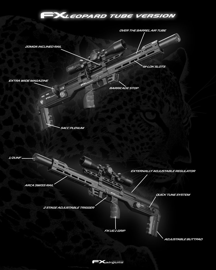 Leopard kombinuje to nejlepší z všech posledních modelů vzduchovek FX. Kartuši okolo hlavně, detailně a snadno nastavitelný výkon, externě nastavitelný regulátor, sportovní nastavitelnou spoušť, pogumovanou rukojeť v AR stylu.
