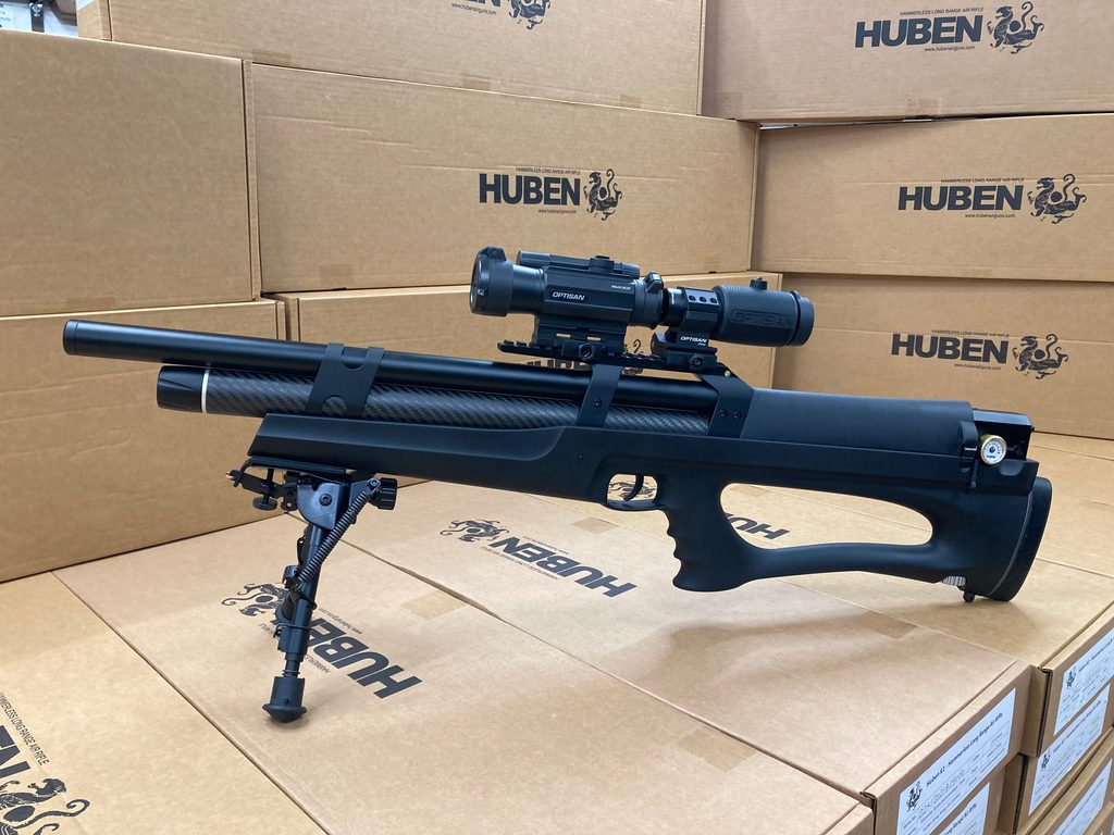 Vzduchovka Huben K 5,5mm je jediný spolehlivý semiauto bullpup v naší nabídce. Huben K1 je větrovka (PCP) v provedení semiauto, to znamená že vzduchovku nemusíte po každém výstřelu znovu natahovat. Huben K1 je netradiční Bullpup, který je dodáván v černé plastové pažbě, která je tzv. ambidextrous a je vhodná jak pro praváka, tak i pro leváka. Vysokopevnostní kartuše titan-dural s povrchovou úpravou "kevlar" má objem 292cm3 a plní se pomocí přiloženého quickfillu až do tlaku 350BAR. Quickfill však nemá závit a pro plnění pomocí tlakové láhve nebo pumpy je potřeba ještě rychlospojka.