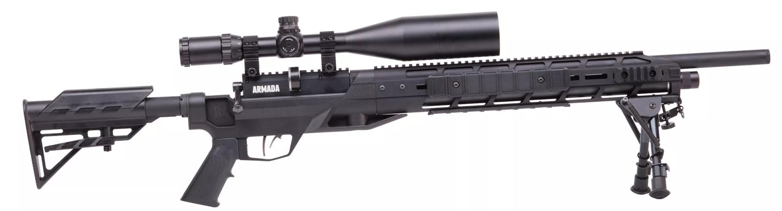 PCP vzduchovka Crosman Benjamin Armada 5,5mm v taktickém setu s puškohledem CenterPoint 4-16x56mm a bipodem. Vzduchovka je výraběna přímo v USA a díky tomu je zbraň velice kvalitně zpracovaná a přesná. Vzduchovka má taktickou pažbu s možností posuvným nastavením lícnice a botky. Pažba vzduchovky je oboustranná a vzhledem k tomu, že je možné kličku přebíjení předělat na druhou stranu, je vzduchovka vhodná i pro leváky.